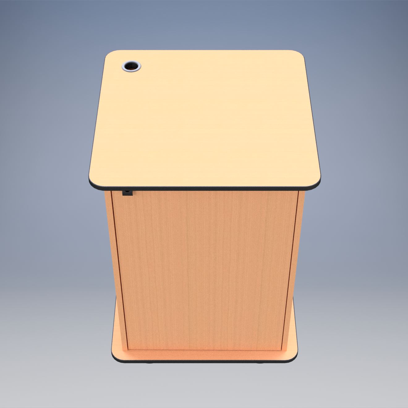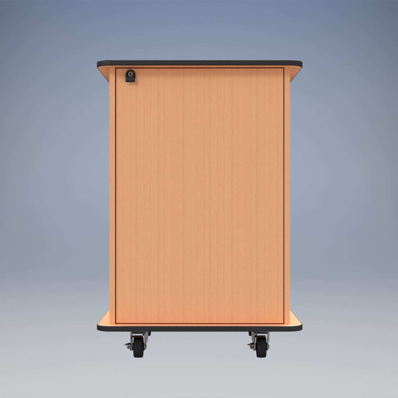 The Projector is a compact and easy way to make your projector a mobile tool that can be safely stored and transported from venue to venue. The projector is strapped onto an adjustable, tilting shelf behind two locked doors for security. Below the projector inside the locked cart, is a storage compartment that can be equipped with adjustable shelves or rack rails. Air vents installed on the left and right of the projector to help remove hot air from around it. A cable port outlet is installed in the top for cables to pass to the projector from a laptop or other video source.